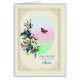 Um belo cartão de aniversário floral para uma mãe. Um buquê adorável de flores azuis e brancas com uma borboleta marrom em voo. A imagem tem uma delicada estrutura de ouro.