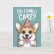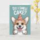 Um cartão de aniversário fofo e engraçado com um adorável desenho animado vestindo um chapéu de festa e sorrindo com entusiasmo sob a frase "Eu sinto cheiro de bolo?" Perfeito para amantes de cachorros, amigos e qualquer um que goste do humor de aniversário lúdico.