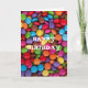 Cartão de aniversário feliz de chocolate com brilho, colorido e vibrante, este design de chocolate arco-íris, doces cobertos de confeitaria é um design divertido para qualquer amante de chocolate, lollies ou doces.