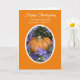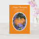 This gorgeous Christian Thanksgiving card features a pumpkin which is surrounded by purple asters in an oval frame with an orange background. A scripture verse appears above the photograph as do the words, "Happy Thanksgiving." Inside, is a beautiful Christian verse about blessings. Copyright Kathy Henis