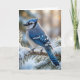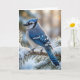 A vibrant blue jay gracefully perched on a snowy pine branch, a stunning contrast against the pristine white landscape.