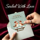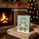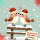 Two sweet winter birds in red Santa hats stand facing each other on a snow covered bench, surrounded by softly falling snow and tiny floating hearts against a soft mint green sky. Their rosy cheeks and gentle poses create a calm romantic feeling that suits cozy evenings and quiet moments together. This Christmas design is a warm way to say you are falling for someone more every day and to share holiday love that feels steady, sincere, and full of affection.