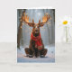 A moose sits in a snowy forest, its antlers adorned with glowing lights, and wearing a bright red scarf that adds a festive touch.