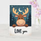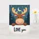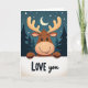 This greeting card shows a sweet night scene with a smiling cartoon moose peeking over a white banner. The moose has rich brown fur, a lighter snout, and big, wide-set eyes that look straight at you with friendly warmth. Its antlers are a glowing golden-orange, which stands out against the deep twilight-blue sky. Above the moose, there’s a crescent moon and scattered white stars, with dark evergreen trees framing the background like a quiet forest. The moose’s front hooves rest on the top edge of the banner, as if it’s gently holding it up for you. On the banner, the words “LOVE you” appear in dark blue letters, simple and easy to read, centered across the white space. It feels meaningful because the moose’s happy expression and the calm night setting make the message come across as sincere and comforting 🥰❤️.