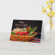 Feliz cartão Cinco de Mayo com cesto de pimentões vermelhos na toalha de mesa festiva