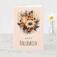 Cartão de Halloween com um buquê de flor elegante, mas gótico. Compostos por tulipas de laranja, margaridas amarelas, folhas de cinza e alvéolos e alguns acentos de orango.