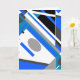 Apresentado é um abstrato, design de inclinação diagonal composto por formas geométricas e linhas em azul real, aqua, preto e cinza sobre fundo branco; inspirado no estilo design MCM.