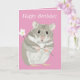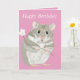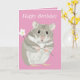 Este cartão de saudação apresenta uma cinza desenhada pela mão e um hamster branco, segurando uma flor contra um fundo rosa. O texto inicial editável diz "Parabéns". O dentro de texto também é totalmente editável para que você possa adicionar sua própria mensagem, se desejar.