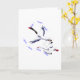 Este cartão de cumprimentos branco apresenta uma ilustração original de dois cisnes em voo na frente, desenhada com linhas limpas e espaço aberto para um visual calmo e moderno. Por dentro, o painel esquerdo inclui uma única pena azul caindo, desenhada a partir da mesma obra de arte, enquanto o lado direito fica em branco para a sua mensagem pessoal.