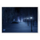 Um caminho coberto de neve que percorre a floresta de pássaros em uma noite escura de inverno. O caminho é alinhado com postes que exibem um brilho azul prateado, mas nas sombras estão formas brilhantes e mesmerizantes como pequenas luzes de fada, atraindo o viajante para fora da trilha. À distância, o brilho lavanda de uma misteriosa floresta se juntando ilumina o céu frio.