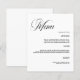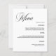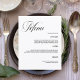 Um fundo branco. Personalize e adicione seus nomes e o menu. Texto preto. 1 folha = 1 menu impresso borda a borda.
