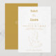 Cartão clássico para salvar a data com um design elegante de pomba branca e dourada. Um cartão lindamente dobrado para anunciar a data do seu casamento num estilo atemporal e refinado. Impresso plano — sem relevo ou textura elevada. Totalmente personalizável com os detalhes do seu evento.