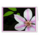 Uma flor brilhante de clematis é mostrada ao centro e balançada pelas suas folhas.
