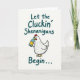 This card shows a plump white cartoon chicken centered on a white background, outlined in black with a red comb and wattle, holding a pale blue bottle with a golden-yellow label tucked under its wing. The chicken’s slight head tilt and sideways glance suggest it’s sharing a private joke with someone close, like a friend leaning in before a toast 💚. Curved teal text sits above the character reading, “Let the Cluckin’ Shenanigans Begin...,” with matching teal lettering arcing below to frame the scene. The rounded lettering stands out crisply against the white space, keeping your eyes on the chicken and its cheeky prop ☘️. Simple shading and minimal details give the bird an easygoing, cartoon look, while the bottle adds a wink of celebration. The open background leaves plenty of breathing room, making the central figure feel like it’s stepping forward to include the viewer in on the fun. The bottle’s pale azure body and bright yellow label sit snugly beneath the chicken’s wing at the center of the design.