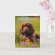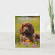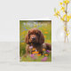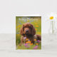 Este cartão de aniversário apresenta um adorável spaniel num campo de flores silvestres.