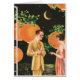Ilustração do vintage de um casal que conversa no terraço no luar. Os ramos de árvore com folhas do verde, água calma do oceano que brilha no luar e grandes luzes alaranjadas do partido são parecem atrás delas.