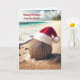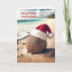Um coco vestindo um chapéu de Papai Noel repousa em uma praia ensolarada com ondas suaves no texto de fundo pode ser mudado.