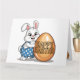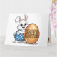 Cartão coelho de Bolinhas felz pascoa. O coelhinho fofo, vestindo macacões azuis e brancos de bolinhas, ficou orgulhoso segurando um ovo de Páscoa que dizia "Felz pascoa", tocando uma pose como se estivesse fazendo audições para "Coelhinho do Ano!"