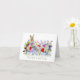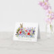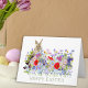 Cartão de saudação de Páscoa de Páscoa e de flor silvestre engraçada e colorida. Bonita mão pintada com primavera florais, incluindo flores de milho e flores de jardim Na parte de trás do cartão está um coelho bonito com três ovos de Páscoa. Fácil de personalizar o script de tipografia de escrita manual verde moderna para que você possa adicionar seu nome de família e saudações de Páscoa. Arte original da artista Catherine Sweetman