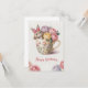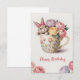 Um cartão de aniversário com uma ilustração alegre em estilo aquarela de um pequeno coelho com um laço rosa vibrante a espreitar de dentro de uma chávena de café de cerâmica e rosas delicadas em tons pastel.