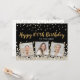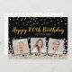 Elegante design de cartão de aniversário personalizado com ouro cintilante e confete prateado sobre fundo preto, tipografia moderna de roteiro com as palavras "Feliz 100º Aniversário" e três das suas fotos favoritas emolduradas em folha de ouro metálico na frente do cartão, juntamente com a sua mensagem e fechando atrás.