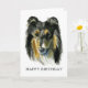 Esta é uma pintura aquosa de um cão collie com aspecto real. Ela tem pelo bronzeado, preto e branco. Diz "feliz aniversário" abaixo da ilustração.
