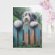 Um cão Collie com barba lisa com peers de pele preto e branco sobre uma cerca de piquete com tinta azul endireitada