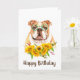 Buldogue bonito com óculos verdes em voga e ilustração de aquarela de buquê de girassol com texto personalizável de "Feliz Aniversário"