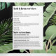 Uma ilustração aquosa das folhas tropicais verdes sobre fundo preto adiciona uma estética química a esta brochura na moda tripla. Uma fonte em negrito na frente mostra seu nome de marca contra o fundo escuro no cobrir frontal. Atualize o texto personalizável para ajustado de sua marca e personalize os detalhes em todo o folheto para seu próprio uso. Estas brochuras 5x7 são do tamanho perfeito para exibir suas listas de preços e o menu de serviços ou descrever sua linha de produtos. Um marketing de excelente a ser entregue a clientes potenciais para apresentar sua empresa rapidamente. Entre em contato com o designer para obter ajuda com variações especiais de configuração ou de layout. Arte e design © 1201AM Design Studio | www.1201am.com