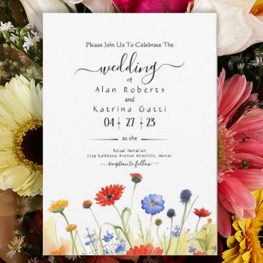Este convite de casamento encantador apresenta uma representação deslumbrante de um prado de primavera adornado com uma vibrante variedade de flores silvestres. A ilustração em aquarela captura a essência da beleza da natureza, fornecendo um cenário pitoresco para os detalhes do seu casamento. A paleta de cores dominante inclui flores amarelas deslumbrantes que irradiam calor e alegria, transitando suavemente para uma cascata de flores laranja-vermelhas e, finalmente, delicadas flores azuis que adicionam um toque de serenidade. Para personalizar ainda mais, clique no link "personalizar ainda mais" e utilize nossa ferramenta de design para ajustar este modelo de acordo com suas preferências.