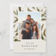 Grupos de cartão com fotos botânicos elegantes do feriado sua foto de família favorita em um fundo das folhas pintados à mão verdes e marrons. Personalize com seu nomes ou nome de família abaixo de um cumprimento do Natal ("alegre e abençoado") na rotulação elegante, clássica. Adicione três fotos adicionais ao verso em um fundo de contraste do verde de caçador, junto com o ano.