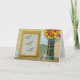 Uma fotograma de madeira se inclina contra um grande fã de bambu e papel ao lado de um vaso cerâmico com flores coloridas. Ao substituir a sua própria fotografia pelo espaço do vazio no quadro da imagem e editar o texto dentro na placa (tudo facilmente realizado usando os modelos fornecidos), você terá um cartão com fotos personalizado e completamente pessoal.