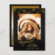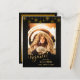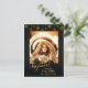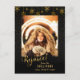 Faíscas de ouro elegantes e festivas e flocos de neve em fundo preto com gráfico de texto caligrafia "Rejoice" e três linhas de texto editável com um lugar para sua foto de feriado. Padrão complementar do floco de neve no verso com campos de texto para seu endereço e saudação.