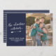 Uma família divertida, o cartão com fotos de Ano Novo perfeito se você perdeu o barco do cartão de Natal! Este design apresenta a frase 'a aventura continua' em uma fonte de script de estilo branco, escrita à mão, sublinhada com uma seta branca desenhada à mão, e sua saudação personalizada embaixo. À direita, coloque sua foto favorita da família. A parte traseira da placa apresenta um padrão de listras brancas, e a cor de fundo geral da placa é marinho azul.