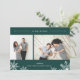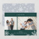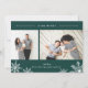 O cartão com fotos elegante e moderno apresenta duas fotos favoritas alinhadas lado a lado, com "tão feliz" no topo em itálico branco e tipografia de blocos em um fundo verde caçador. Personalize com sua saudação personalizada e seu nome na parte inferior, acentuado por quatro ilustrações brancas do floco de neve. A placa se reverte para um padrão de queda de neve em branco sobre preto.