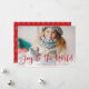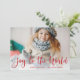 Crie seus cartões com fotos de férias rápida e facilmente com este design simples e elegante. A placa apresenta a sua foto favorita horizontal ou orientada a paisagem em sangria de cheio, com "alegria ao mundo" sobreposta em letras brilhantes de escrita vermelha de Natal. Personalize com seus nomes e o ano na base. Cartões invertem para um padrão geométrico moderno em vermelho e branco.