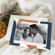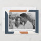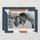 Design de Natal moderno com a sua foto horizontal escolhida, moldada por formas de abstrato pintadas em marinho e ferrugem com um fundo colorido creme. Personalize o cartão de feriado de abstrato, adicionando uma saudação personalizada e o(s) seu(s) nome(s). A placa reverte para um plano de fundo do traçado do pincel do marinho.