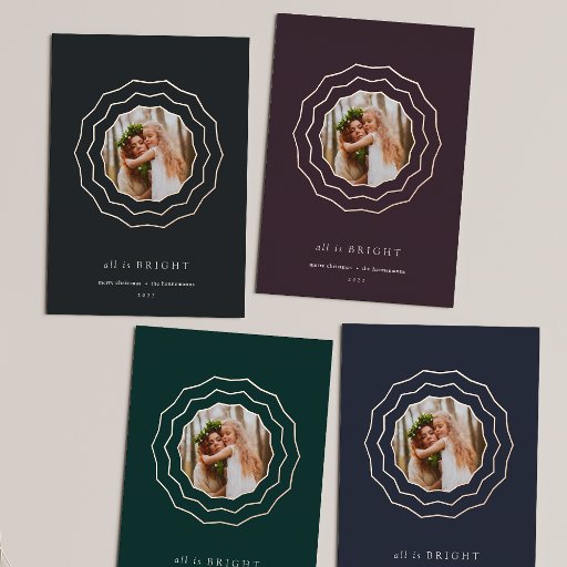 Compartilhe cartões de natal com essas Cartões de foto de Natal quentes e minimalistas que apresentam sua foto favorita emoldurada por uma fina estrutura geométrica em folha de ouro falso, em um rico fundo de carvão preto. "All is bright" aparece abaixo em letras brancas serif e itálicas. Personalize com sua saudação e nomes personalizados abaixo e adicione três fotos adicionais ao verso, juntamente com mais texto personalizado para nomes individuais ou uma mensagem pessoal. Um cartão de férias elegante com uma estética moderna e mínima que permite brilhar a sua foto favorita.