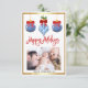 Modelo Editável da Xadrez Cartão com fotos da Família Ginger Preppy Ginger Azul de Natal Branco. Design apresenta adoráveis ornamentos de Chinoiserie, elementos de folha de ouro falsos e xadrez de búfalos Use esta modelo de Natal para os feriados!
