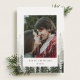 Cartão de Natal da Floresta de Pinheiros Rústicos, verde-escuro, desenhado por Shelby Allison, que pode ser personalizado com uma foto e texto na frente, assim como uma foto e uma saudação opcionais no verso.