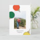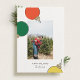 Um design de cartão de feriado moderno com 3 ornamentos retrorados em vermelho, verde e amarelo rodeando uma foto personalizada acima de uma saudação e assinatura sazonais personalizadas. Design por Shelby Allison e foto de Joseph Gonzalez em Unsplash