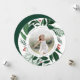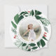 Cartão com fotos elegante em forma redonda única apresenta uma foto favorita cercada por uma rica folhagem botânica verde da floresta e minúsculos bagos vermelhos. Personalize com um cartões de natal personalizado (mostrado com "deixe o céu e a natureza cantar"), e seus nomes curvados em torno da foto.