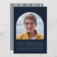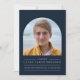 Anuncie a formatura do seu filho com este cartão com fotos moderno. O cartão é azul-marinho, tem um buraco de imagem em forma de cúpula. A parte traseira da placa tem faixas brancas náuticas sobre fundo azul marinho. Personalize facilmente este cartão de anúncio de graduação com a foto e os detalhes do seu formando. Se você precisar de alterações no design, como cor, texto ou fonte; entre em contato conosco em seamistmail@gmail.com. Adoramos fazer parte de suas memórias felizes.