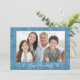 Um cartão com fotos de na moda para Chanucá com borda de padrão geométrico azul e menorras brancas com texto feliz de Chanucá. Adicione sua foto favorita e sentimentos adicionais nas costas para uma saudação especial a Hanukkah.