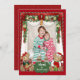 O modelo cartão com fotos adorável apresenta uma terra verde-esverdeada e cortinas brancas com dois ursos de Natal bonitos vestidos em suas fantasias de férias. Ursinho está embrulhando um presente e ursinho está segurando um biscoito de pão de gengibre. O quadro fotográfico está pronto para você adicionar sua foto. Personalize o texto com seus nomes familiares.