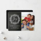 Envie um cartão de natal moderno e único este ano que sua família e amigos vão amar. Nosso cartão de festas contemporâneo apresenta uma imagem decorativa branca que mostra a tipografia dizendo "alegria" definida em um fundo preto. A parte traseira oferece espaço adicional para fotos e mensagens extras.