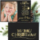 Um cartão com fotos de feriado maravilhoso com fundo preto e texto dourado que lê Feliz Natal e Feliz ano novo na frente, Feliz Natal na parte de trás. A frente tem uma árvore de férias de ouro, floco de neve e uma área que você pode adicionar sua própria foto e nome de família! i>Fotografia © Storytree Studios, Stanford, CA