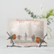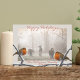 Dois robins festivos sentados em galhos cobertos de neve. Carregue sua própria foto de Natal para substituir a que aparece. Personalize com sua saudação festiva e seu nome familiar. Fotografia gentilmente fornecida pela Storytree Studios. Fotografia © Storytree Studios, Stanford, CA.