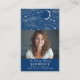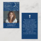 Cartões de Oração Memorial da Noite Estrelada. Estas pequenas cartas de oração azuis com um céu estrelado e a lua fornecem uma lembrança memorável que é ideal para comemorar o seu amado em qualquer funeral ou celebração de serviço de vida. A frente da placa apresenta elegantemente o texto "In Loving Memory" sob uma fotografia, juntamente com o nome e as datas. Ao contrário, o cartão é projetado para acomodar um poema personalizado, oferecendo a opção de personalizá-lo ou substituí-lo inteiramente por palavras de sua escolha.