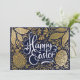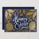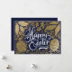 Cartão com fotos de Páscoa Elegante. Roteiro de felz pascoa enquadrado com folhas, flores e ovos em folha de ouro azul bonito sobre fundo azul marinho. A parte traseira da placa apresenta o modelo de foto do solteiro e a linha de texto para nome e ano com a coordenação do fundo azul.
